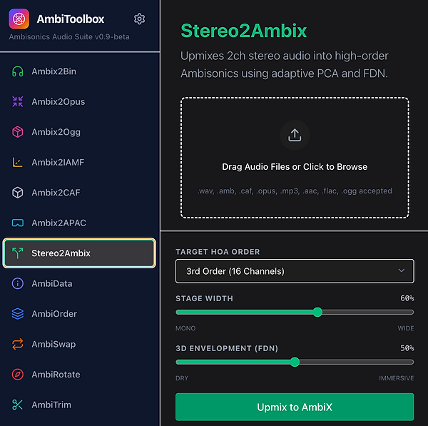 Stereo to Ambisonics Upmixing (Stereo2Ambix): Convert standard 2-channel stereo audio into high-order Ambisonics using adaptive PCA. Users can adjust parameters like "Stage Width" and "3D Envelopment" via dedicated sliders.